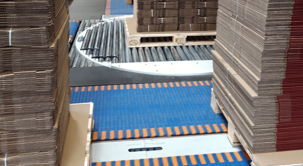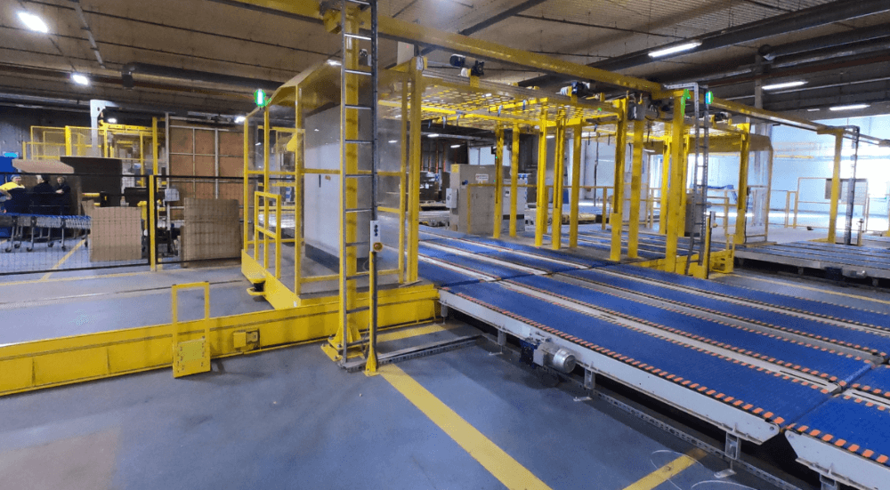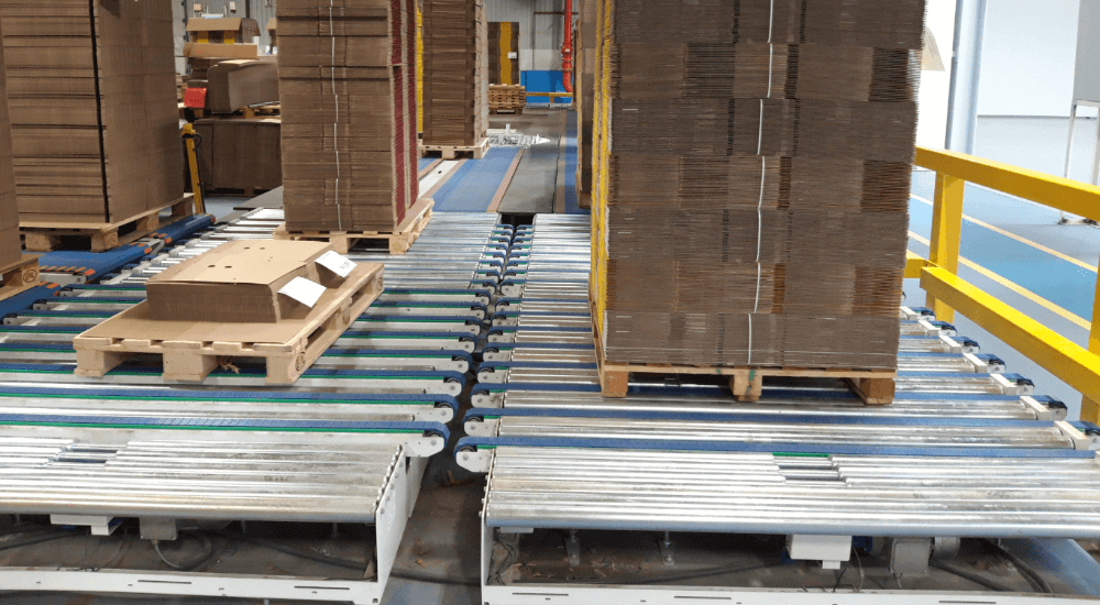 Zakres naszych prac: zaprojektowanie i wykonanie transporterów taśmowych modułowych jako buforów za maszynami produkcyjnymi – bufory w nitkach pojedynczych lub podwójnych; zaprojektowanie i wykonanie transportera mobilnego tzw. tramwaju – wyposażonego w osiem stanowisk paletowych z dociskami o łącznej nośności 8 ton, konstrukcja tramwaju umożliwia również transfer dużych pakietów. Transportery na linii pakującej: transportery odbiorcze z tramwaju – taśmowe modułowe oraz uzupełnienie linii w transportery paletowe łańcuchowe, krzyżowe – rolkowo-pasowe oraz obrotnice rolkowe. Zakres zadania obejmował także część automatyki i sterowania do naszych urządzeń z uwzględnieniem bezpieczeństwa. Zadanie wymagało integracji z systemem informatycznym Klienta.