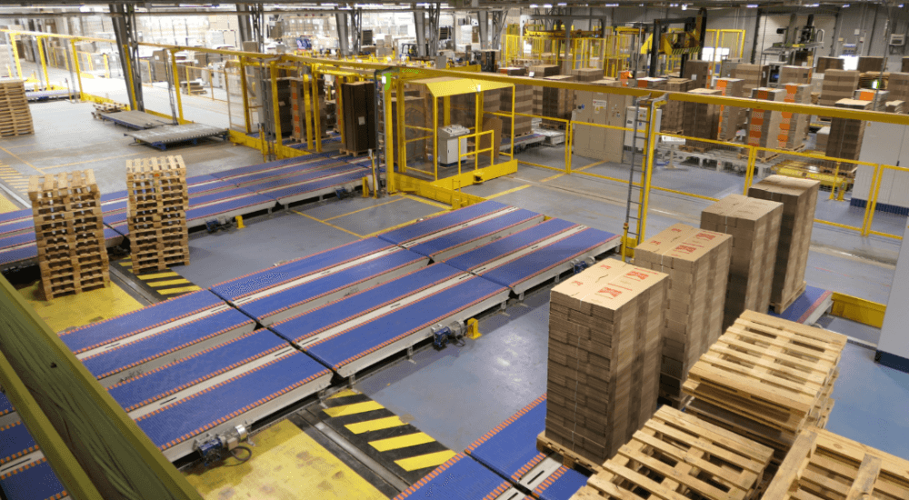 Układ odbioru palet z maszyn produkcyjnych oraz transfer za pomocą tramwaju na linię pakowania
